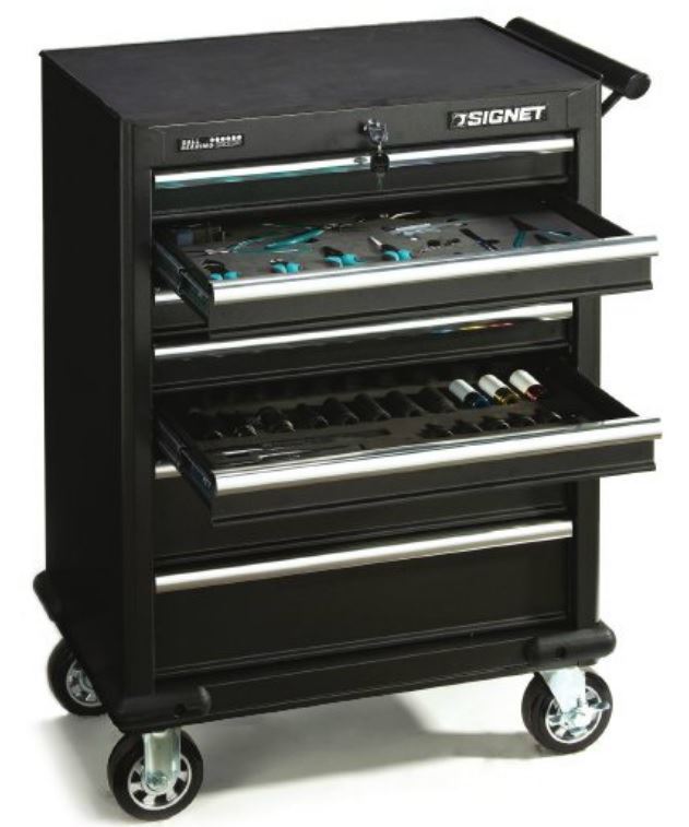 ארונות/עגלות 7 מגירות מאובזרות הכוללת 147 כלים ב- 9 מגשים, רוחב כללי: 675 מ"מ, עומק כללי 460מ"מ, גובה כללי:1000מ"מ כולל גלגלים, משקל: 55ק"ג, בצבעים: שחור/אדום/כחול, מקטים: 054301-054303 SIGNET