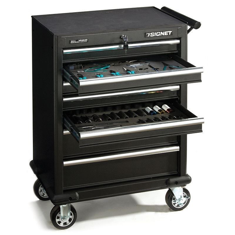 ארונות/עגלות 7 מגירות מאובזרות הכוללת 168 כלים ב- 9 מגשים ופטיש אויר "1/2 ורצ'ט אויר "1/2, רוחב כללי: 675 מ"מ, עומק כללי 460מ"מ, גובה כללי:1000מ"מ כולל גלגלים, משקל:55 ק"ג, בצבעים: שחור/אדום/כחול, מקטים: 054305-054307 SIGNET