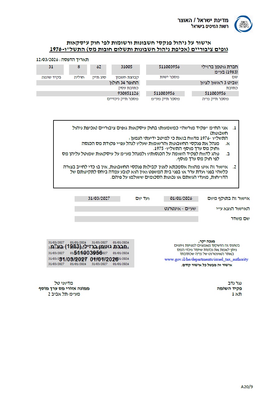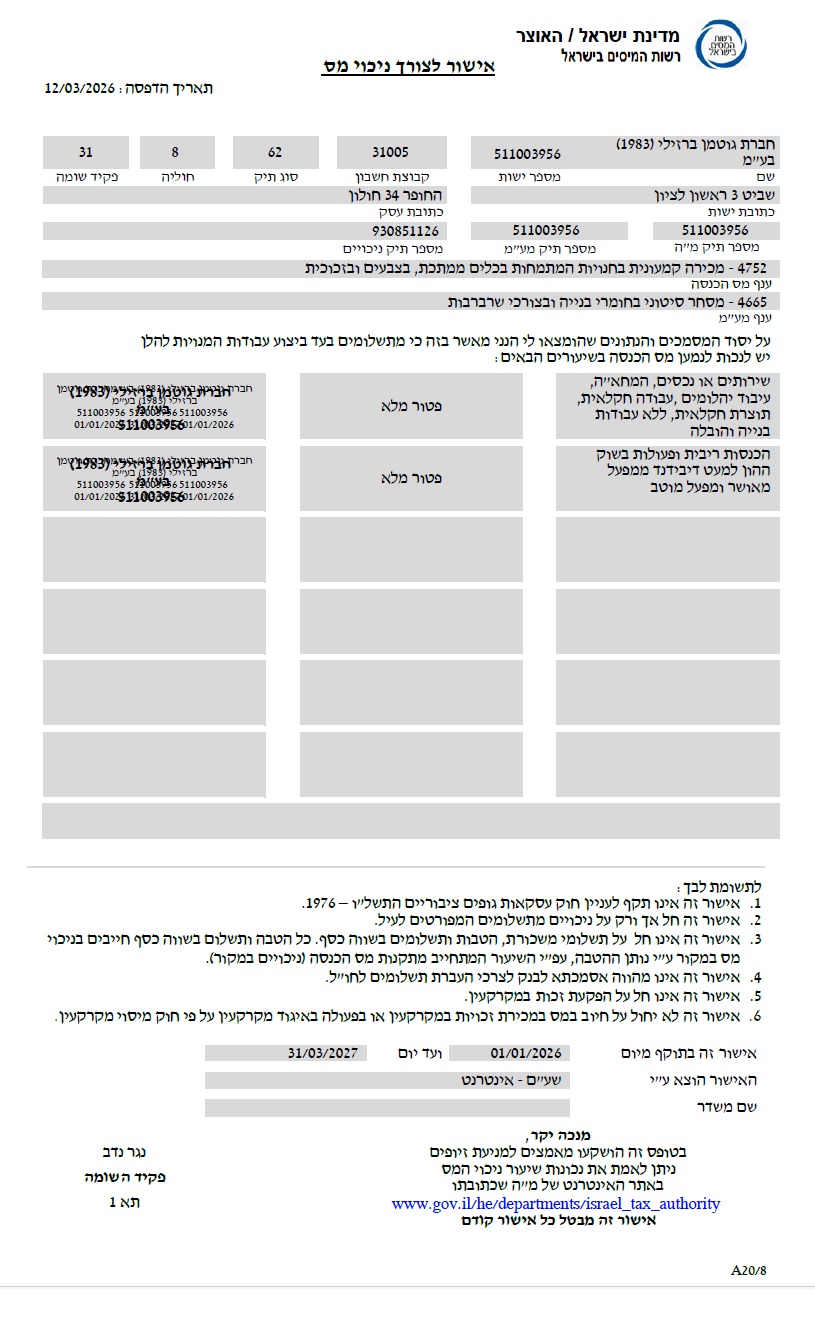 אישור לצורך ניכוי מס ואישור על ניהול פנקסי חשבונות 2026/2027
