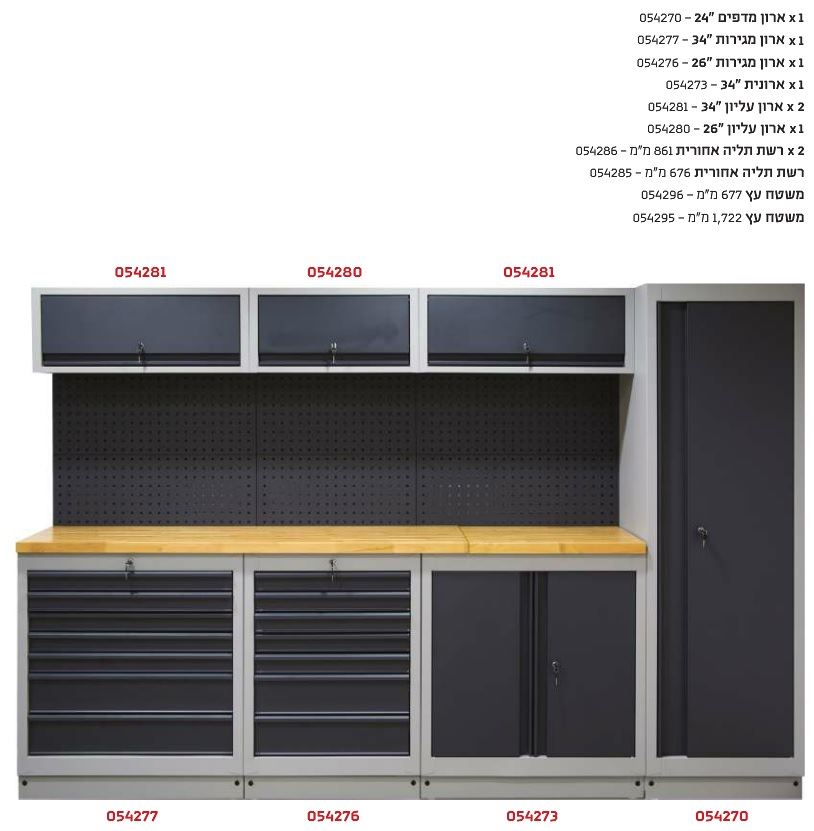 תחנת עבודה נייחת ואחסון TYPE F OSM עם משטח עץ, כולל: ארון מגירות, ארון מדפים, ארונית, ארון עליון, רשתות תליה אחורית, משטחי עץ, אורך: 3000מ"מ, עומק: 526מ"מ, גובה: 1980מ"מ, מקט: 054269 SIGNET