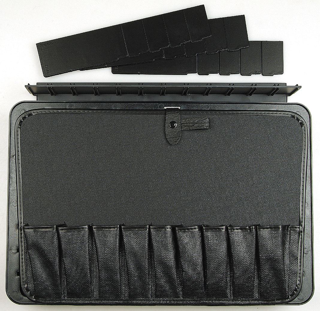 תחתית מגש מחומר תרמופלסטי (ABS) עם חוצצים תואמים (1 לאורך, 3 אלכסונית) פלטה לכלים מתפרקת הניתנת להוספה/להחלפה במזוודת HEPCO&BECKER. עמידה למים ולשמן, ועשויה מפלסטיק (PE). תאי הכלים עשויים מרשת פלסטיק מחוזקת חלק עליון עם 9 תאים