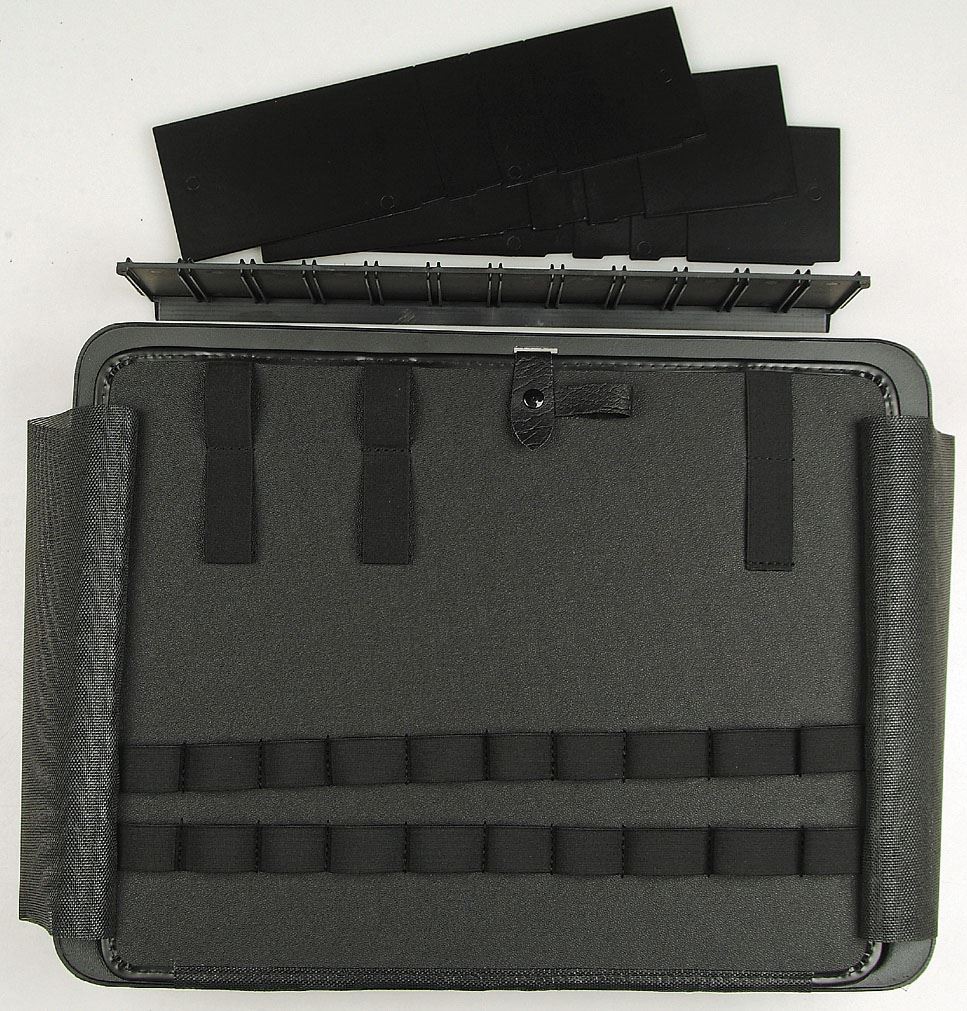 תחתית מגש מחומר תרמופלסטי (ABS) עם חוצצים תואמים (1 לאורך, 3 אלכסונית) פלטה לכלים מתפרקת הניתנת להוספה/להחלפה במזוודת הפקו&בקר. עמידה למים ולשמן, ועשויה מפלסטיק (PE). חלק עליון עם 26 טבעות גומי וכיסוי HEPCO & BECKER