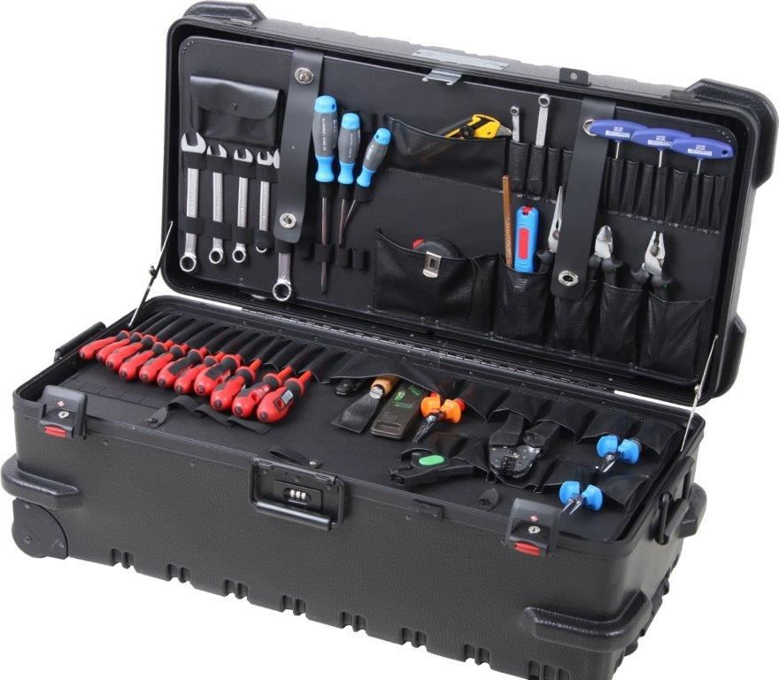 Top-professional-quality "Made in USA", extreme robust version, nearly undestructible, High-density-PE-shell additionally strengthened by special rip-design, maximal strengthened and powdercoated aluminium frame, additional bumpers for protection of handles and locks, snap-down-ergonomic handle, additional snap-down-ergonomic handle on the top, lockable screwed metal locks, additional fixing for padlock, piano hinge, shell more than 20 times rivited and connected with the frame, integrated trolleysystem, Inline-Skate-wheels, strong lid-holders, bottom completely empty to carry bigger (electrical) tools etc. size:805X310X370 mm