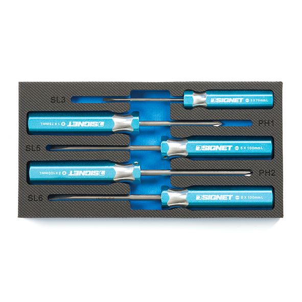 הסט כולל: 1 מברג שטוח 3-7 1 מברג שטוח 5-100 1 מברג שטוח 6-100 1 מברג פיליפס 1-75 1 מברג פיליפס 2-100 SIGNET