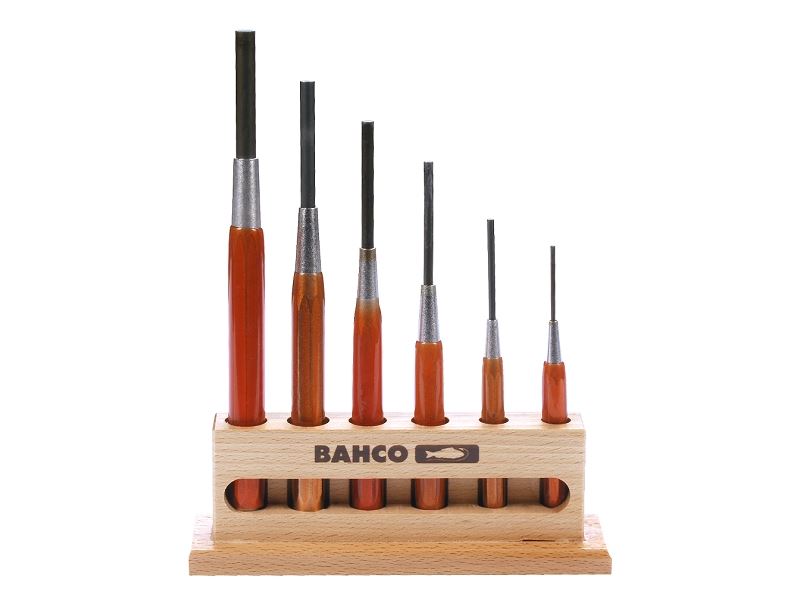 סט של מקבים 3646מקבילים / ישרים גימור: ציפוי ניקל, ראש אימפקט בטיחותי חומר: ונדיום מיוחד, כיסוי פלסטיק תקן DIN 6450, צורה D. פין מושחז ומלוטש, קנה מתומן בתוך מעמד מעץ מקט:3646/6 ,יצרן:BAHCO