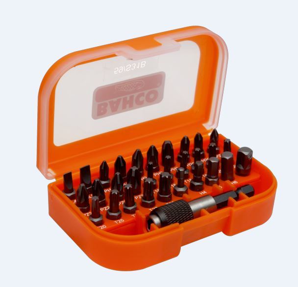 31 pcs bit set for slotted, Phillips, Pozidriv, TORX®, Hexagon head screws, bit holder and socket adaptor 1/4",In cardboard packaging,Drive: 1/4" DIN 3126-C6.3, ISO 1173,Finish: Sand blasting,Material: S2 high alloy steel,59/S31B-IP: in bulk. Served in a counter display of 12pcs