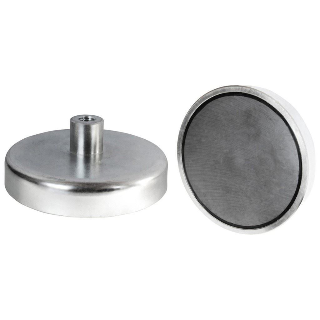 200° maximum operating temperature,Excellent resistance to corrosion,Mild steel pot with zinc plated body.Internal Threaded Stud Pot Magnet.Female.Threaded Stud Pot Magnet.The internal threaded stud pot magnet is also known as a female threaded stud pot magnet. They consist of a ferromagnetic mild steel cup containing a magnet (usually a disc magnet) with a ferromagnetic mild steel stud / boss / bush mounting at the back of the pot magnet into which a threaded hole has been made. These pot magnets are known as female threaded stud pot magnets because the internal threaded hole could take pot magnets with threaded bar at the back (external threaded stud pot magnets / male threaded stud pot magnets) as well as bolts.Because the mild steel is stud / boss is threaded there is decent thread length allowing reasonably high torque to be applied to securely hold each pot magnet in place.Samarium Cobalt Internal Threaded Stud Pot Magnet.The Samarium cobalt SmCo version of the internal threaded stud pot magnet can be used at temperatures up to +200 degrees C.