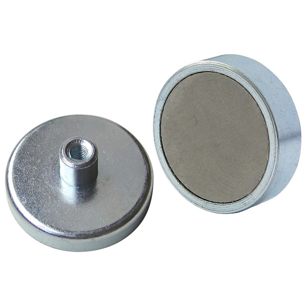 120° maximum operating temperature. Excellent resistance to corrosion.Mild steel pot with zinc plated body.Female threadInternal Threaded Stud Pot Magnet / Female Threaded Stud Pot Magnet.The internal threaded stud pot magnet is also known as a female threaded stud pot magnet. They consist of a ferromagnetic mild steel cup containing a magnet (usually a disc magnet) with a ferromagnetic mild steel stud / boss / bush mounting at the back of the pot magnet into which a threaded hole has been made. These pot magnets are known as female threaded stud pot magnets because the internal threaded hole could take pot magnets with threaded bar at the back (external threaded stud pot magnets / male threaded stud pot magnets) as well as bolts.Because the mild steel is stud / boss is threaded there is decent thread length allowing reasonably high torque to be applied to securely hold each pot magnet in place.The ferrite version of the internal threaded stud pot magnet can be used at temperatures up to +120 degrees C and is suitable for almost any application.