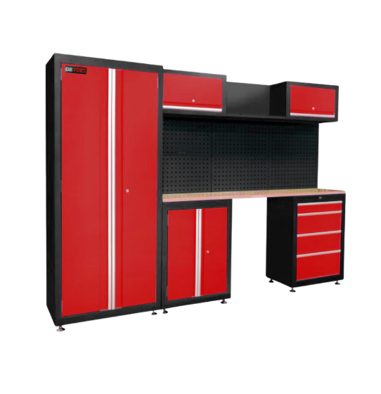 עמדת עבודה + 2 יחידות אחסון עליונות + 3 לוחות גדולים לתליית כלים + עגלת כלים צדדית + יחידת אחסון עם דלתות נפתחות + ארון גדול לאחסון