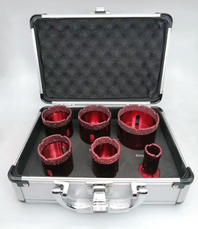 סט מקדחי יהלום במארז קשיח איכותי הכולל 6 יחידות במידות : 20, 35,40,45,50,60 מ"מ סה"כ 6 יחידות לעבודה עם משחזת זוית קנה חיבור M14 מתאים לפורצלן גניט וזכוכית