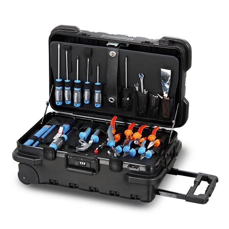 Top-professional-quality "Made in USA", extreme robust version, nearly undestructible, High-density-PE-shell additionally strengthened by special rip-design, maximal strengthened and powdercoated aluminium frame, additional bumpers for protection of handles and locks, snap-down-ergonomic handle, additional snap-down-ergonomic handle on the top, lockable screwed metal locks, additional fixing for padlock, piano hinge, shell more than 20 times rivited and connected with the frame, integrated trolleysystem, Inline-Skate-wheels, strong lid-holders, bottom completely empty to carry bigger (electrical) tools etc. size:805X310X370 mm