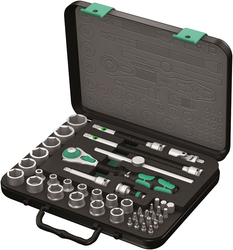 סט בוקסות SB 2 Zyklop 8100, מוביל 3/8", מטרי. סט 43 חלקים בארגז מתכת חזק. 1 רצ'ט Zyklop עם הינע 3/8", 18 וקסות Zyklop (מידות מטריות), 2 מאריכי ציקלופ (קצר וארוך) מסוג נעילה גמישה עם שרוול מסתובב בחופשיות, 1 ידית T מחליקה, 1 מאריך כדורי, 1 מחבר אוניברסלי, 1 מתאם עם תפסנית לשחרור מהיר, 18 ביטים WERA.מידות: 8000 B 1 x 3/8"x199,0;8790 HMB 1 x 6,0x29,0; 1 x 7,0x29,0; 1 x 8,0x29,0; 1 x 9,0x29,0; 1 x 10,0x29,0; 1 x 11,0x29,0; 1 x 12,0x29,0; 1 x 13,0x29,0; 1 x 14,0x29,0; 1 x 15,0x29,0; 1 x 16,0x30,0; 1 x 17,0x30,0; 1 x 18,0x30,0; 1 x 19,0x30,0; 1 x 20,0x30,0; 1 x 21,0x30,0; 1 x 22,0x30,0; 1 x 24,0x32,0;8789 B 1 x 3/8"x165,0;8794 B 1 x 3/8"x76,0;8795 B 1 x 3/8"x50,0;8784 B1 1 x 1/4"x3/8"x44,0;8796 SB 1 x 3/8"x125,0;8796 LB 1 x 3/8"x200,0;840/1 Z Hex-Plus 1 x 3,0x25; 1 x 4,0x25; 1 x 5,0x25; 1 x 6,0x25; 1 x 8,0x25; 1 x 10,0x25;867/1 Z TORX® BO 1 x TX 10x25; 1 x TX 15x25; 1 x TX 20x25; 1 x TX 25x25; 1 x TX 27x25; 1 x TX 30x25; 1 x TX 40x25;800/1 Z 1 x 1,0x5,5x25;851/1 Z PH 1 x PH 2x25; 1 x PH 3x25;855/1 Z PZ 1 x PZ 2x25; 1 x PZ 3x25;