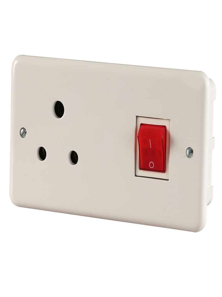 מפסק דו-פול עם שקע למזגן  תה"ט, המאפשר שליטה נפרדת על הפעלת המזגן והכיבוי שלו. מתאים לחיבור מזגן ולשליטה על מערכת החשמל בצורה בטוחה ויעילה.