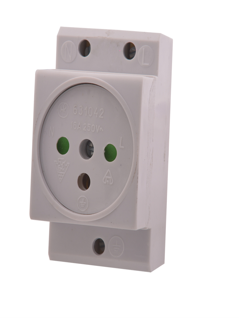 שקע כוח 16A ו-250V, מיועד להתקנה על פס או מסילה, מספק חיבור יציב למכשירים עם דרישות חשמליות גבוהות. מתאים לשימוש במערכות חשמליות תעשייתיות ותחזוקה.