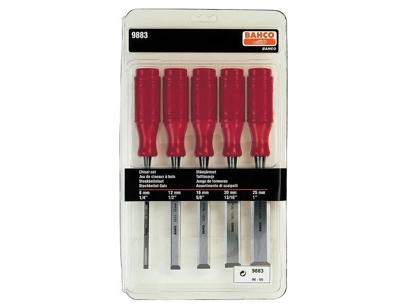סט מפסלות לעץ עם ידית עשויה מחומר פלסטיק אדום קשיח מאוד יש להשתמש בפטיש או אלה בזהירות לכל האיזמלים יש להבים מפלדת כלים באיכות גבוהה עם צוואר משופע איזמלים ומפסלות עם תבנית משופעת מלאה, כלומר צדי הלהבים יוצרו בשיפוע בערך עד מחצית מעובי הלהב מושחז ומוכן לשימוש צד שטוח אחד מונע גלגול של האיזמל ממשטח העבודה מקט:9883 ,יצרן:BAHCO