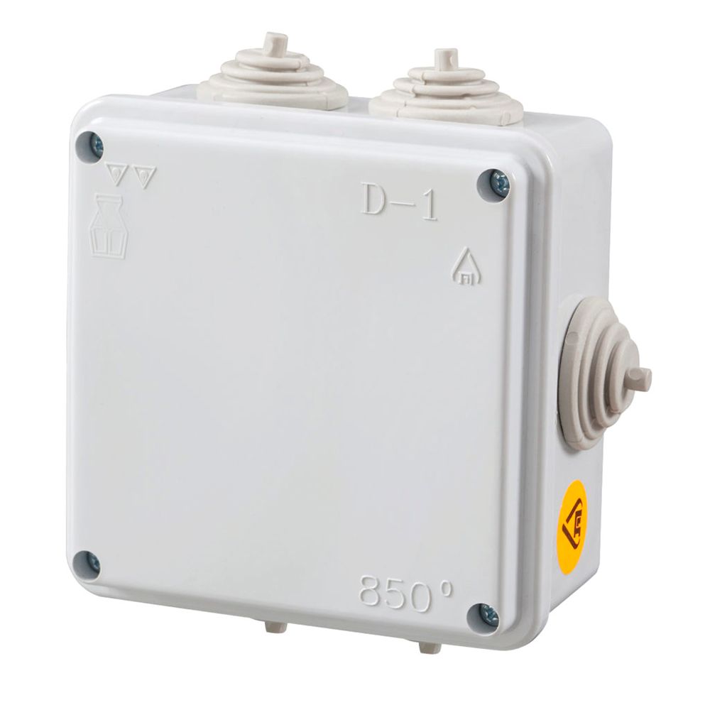 קופסת חיבור דגם D-1P בצבע אפור, במידות 100x100x50 מ"מ, מיועדת להתקנה חיצונית על הטיח. עם דרגת אטימות IP55 ותו תקן ישראלי.