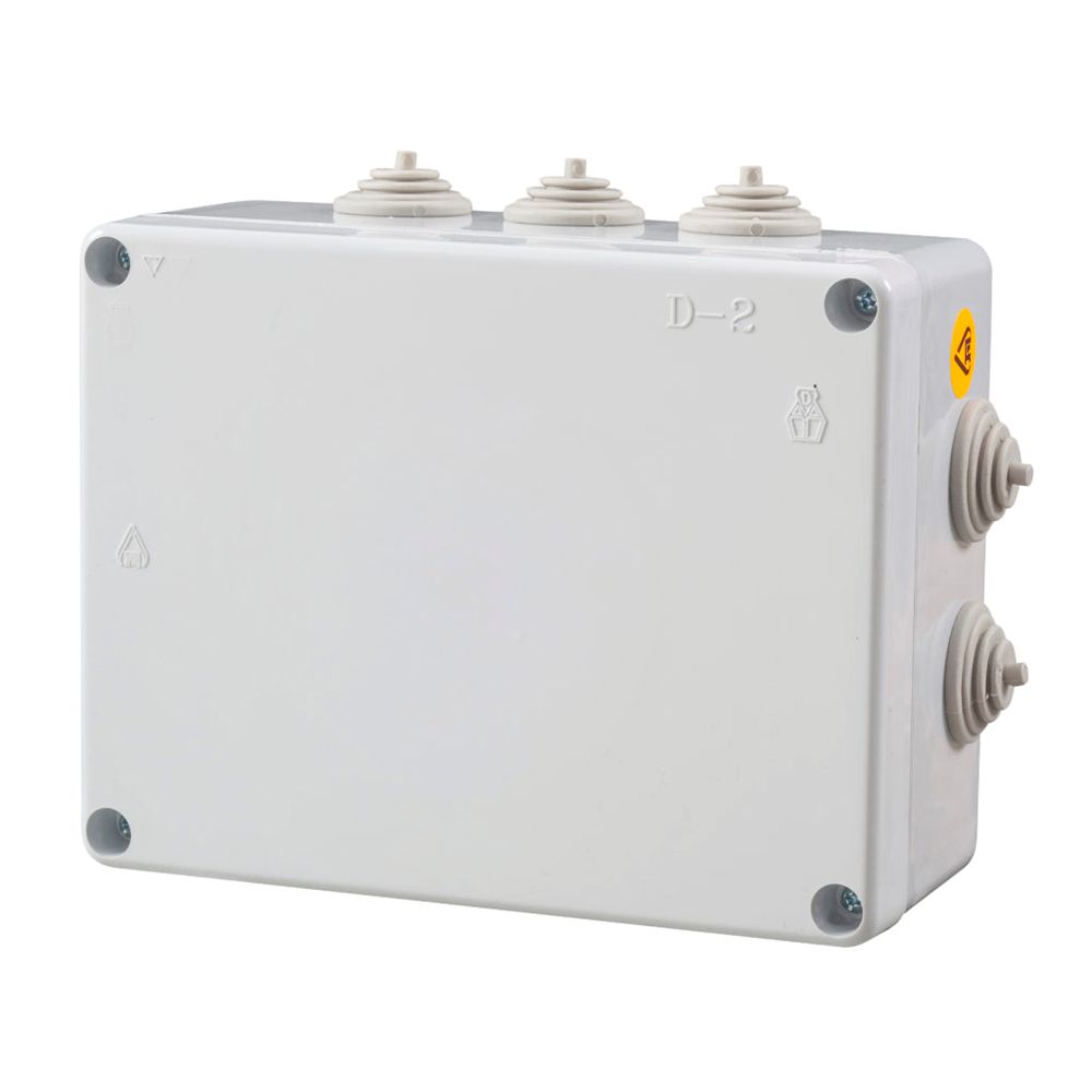 קופסת חיבור דגם D-2P בצבע אפור, במידות 190x150x80 מ"מ, המתאימה להתקנה חיצונית על הטיח. עם דרגת אטימות IP55 ותו תקן ישראלי.
