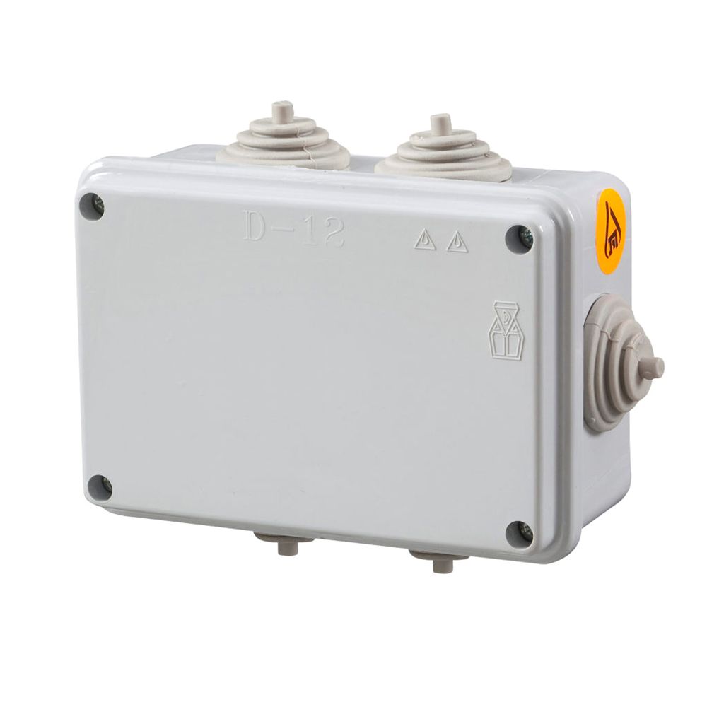 קופסת התקנה חיצונית דגם D-12 בצבע אפור, במידות 120x80x50 מ"מ, עם פיטמות. עמידה בדרגת אטימות IP55. מיוצרת בישראל ומגיעה עם תו תקן ישראלי.