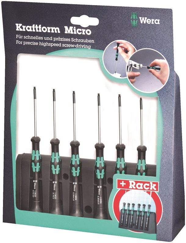סט מברגים טורקס עם חור 2067/6 TORX BO ומתקן תלייה ליישומי אלקטרוניקה WERA, יישום: בורגי שקע TORX עם פין בטיחות(BO= עם פין בטיחות), תכולה: סט 6 חלקים בקרטון תצוגה. 2067 TORX® BO Micro 1 x TX 7x60; 1 x TX 8x60; 1 x TX 9x60; 1 x TX 10x60; 1 x TX 15x60; 1 x TX 20x60; סט מברגי שען, סט מברגי מיני/שען