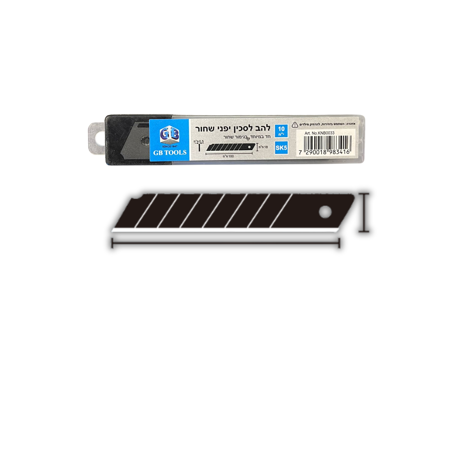 סט 10 להבים לסכין יפנית 18 מ"מ מידות: 100×18×0.5 מ"מ חומר: פלדת SK5 איכותית 7 מקטעים (שבירה מדורגת) גימור שחור