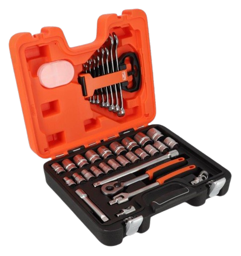 הסט כולל 21 בוקסות 1/2" משושה: AF 13/16", 7/8", 15/16", 31/32", 1", 1-1/16", 1-1/8", 1-3 /16", 1-1/4", 3/8", 7/16", 15/32", 1/2", 9/16", 19/32", 5/8", 21/32" , 11/16", 23/32", 3/4", 25/32 אינץ' 1 pc 1/2 אינץ' שחרור מהיר, שיניים של 60°/זווית פעולה של 6° 2 מאריכים 5 אינץ' ו-10 אינץ' , מפרק אוניברסלי, מתאם T בגודל 1/2 אינץ' 8 מפתחות רינג פתוח מידות : AF 1/4", 5/16", 3/8", 7/16", 1/2", 9/16", 11/16", 3/4", 1 יחידת קופסת פלסטיק תלת חלקית נשלפת עם מכסה תוצרת BAHCO